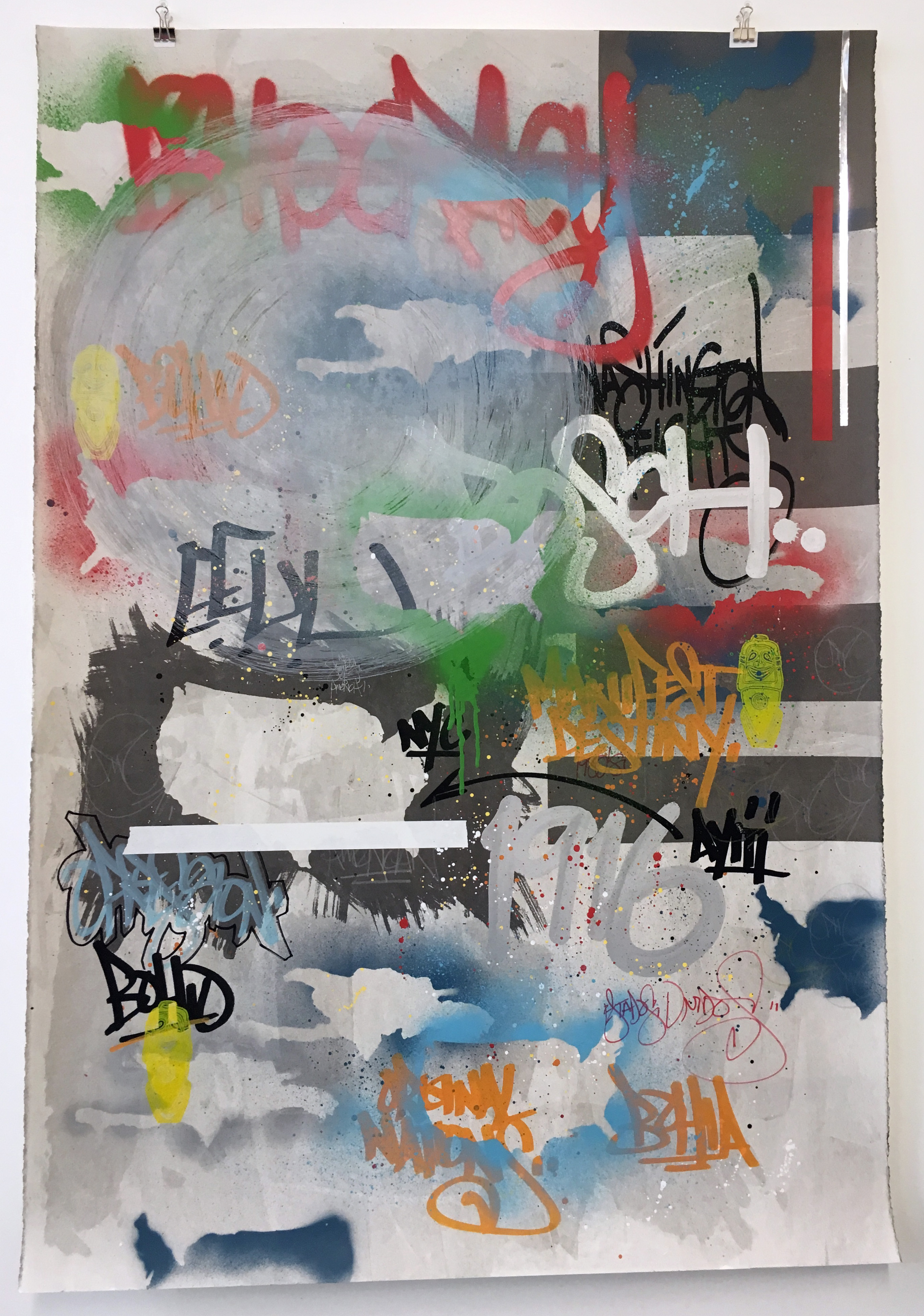 Referencing the duality of the word, batey, artists Carlos Jesús Martínez Domínguez/FEEGZ and Pepe Coronado address New York City's race and class dynamics. The combination of prints, painting, and typography is at once an ode to the original concept of a batey with festive and numinous aspects. The graffiti map tags the names of numerous communities found throughout New York City's Uptown scene (defined here as north of 99th street) including Harlem, El Barrio, Sugar Hill, Le Petit Senegal, Washington Heights, and more.